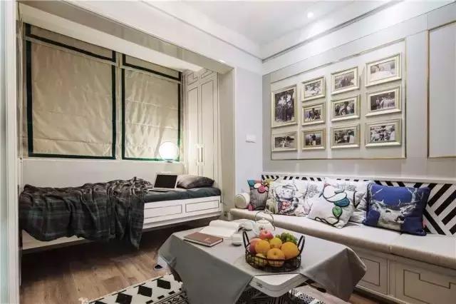 设计师把老人和小夫妻的房间互换,靠墙定制了一排沙发,沙发和护墙板同样是用老地板改造而成,值得一提的是,对于小户型而言,家具必须兼顾储存功能,定制的沙发也一样。
